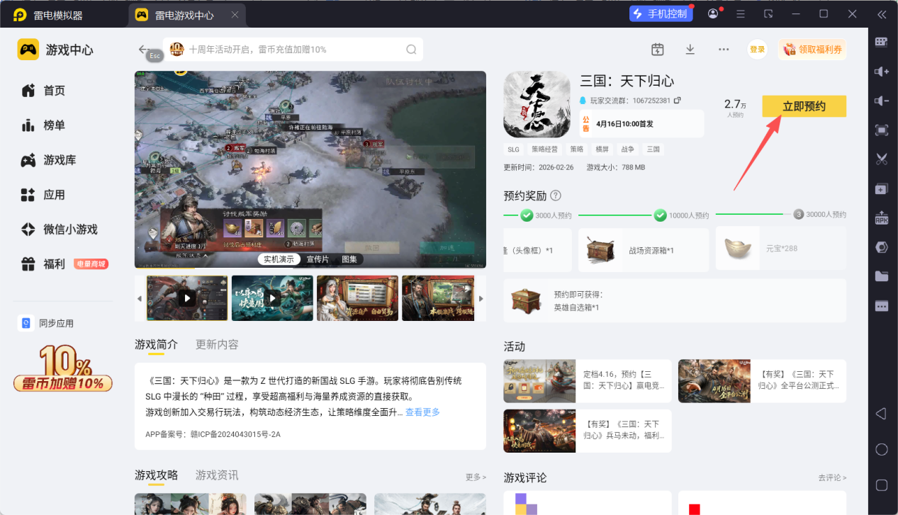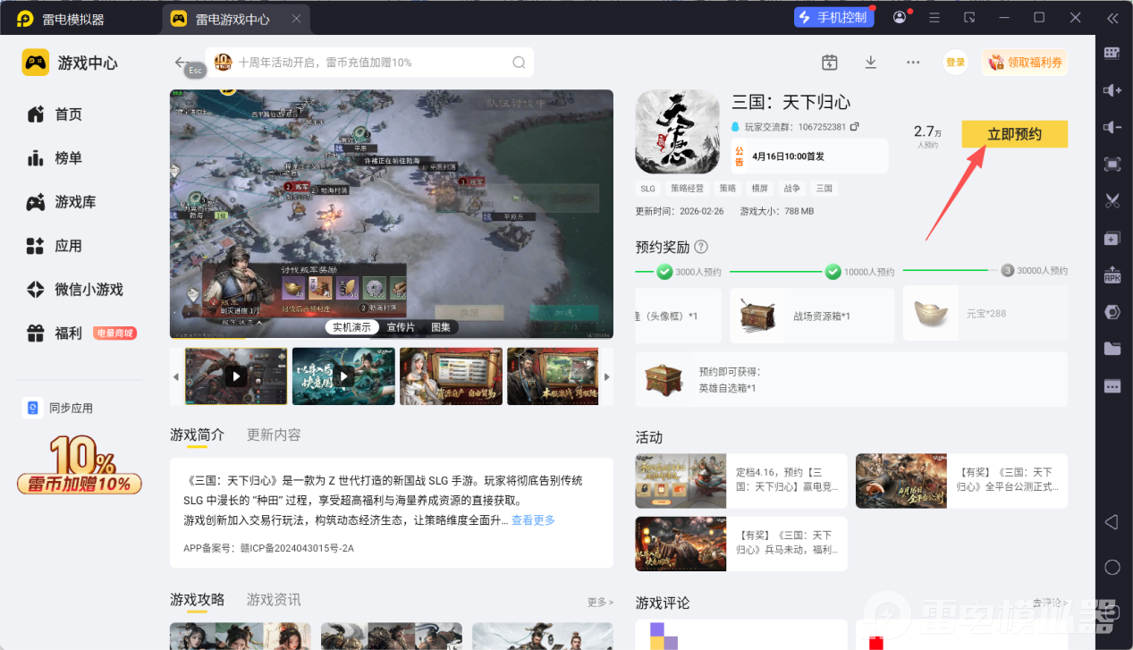 进入模拟器后,在内置的雷电游戏中心搜索“三国天下归心”,找到对应游戏后,点击“立即预约”,在游戏上线后系统会第一时间通知玩家并自动下载,下载安装完成后在应用栏中找到游戏即可游玩。
