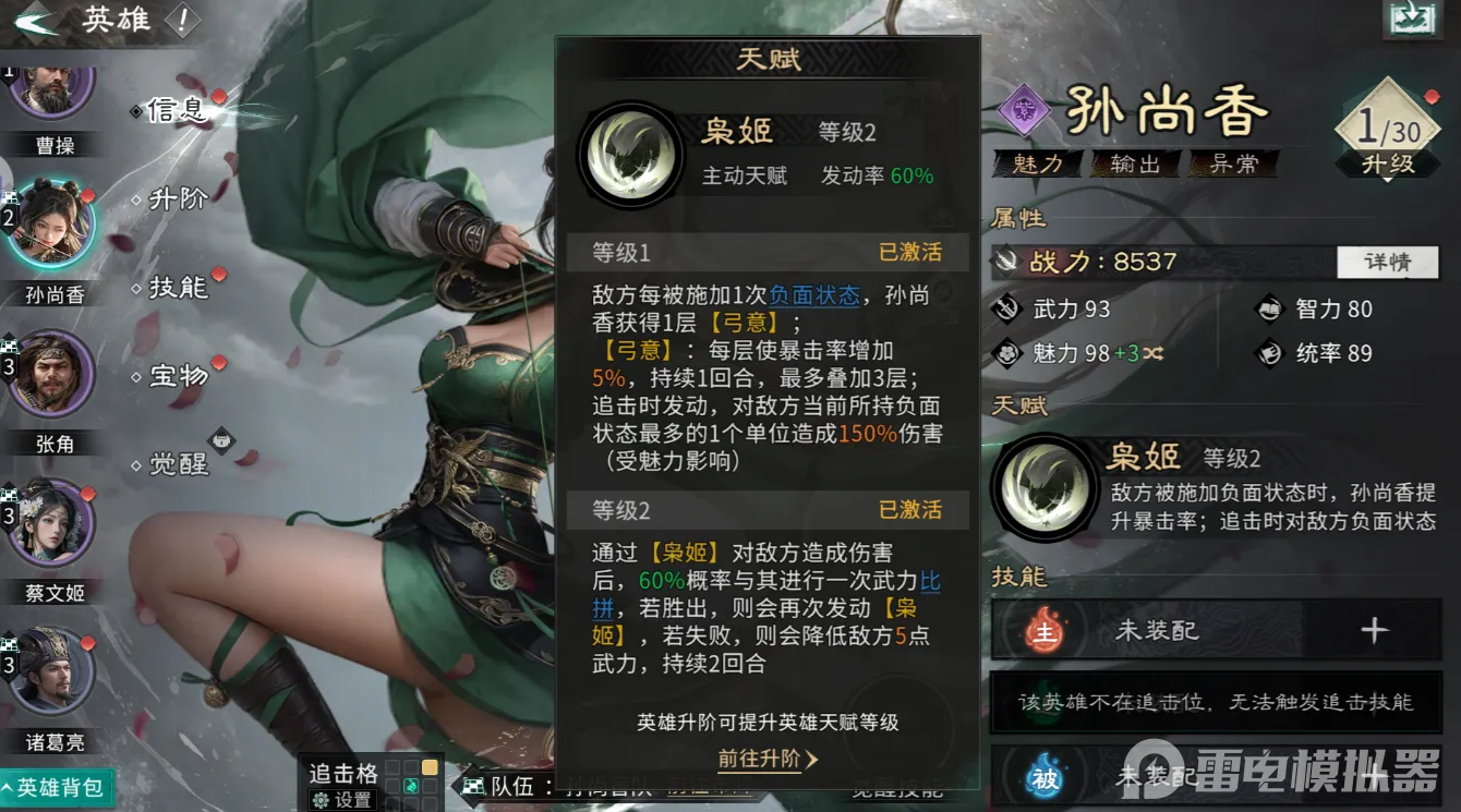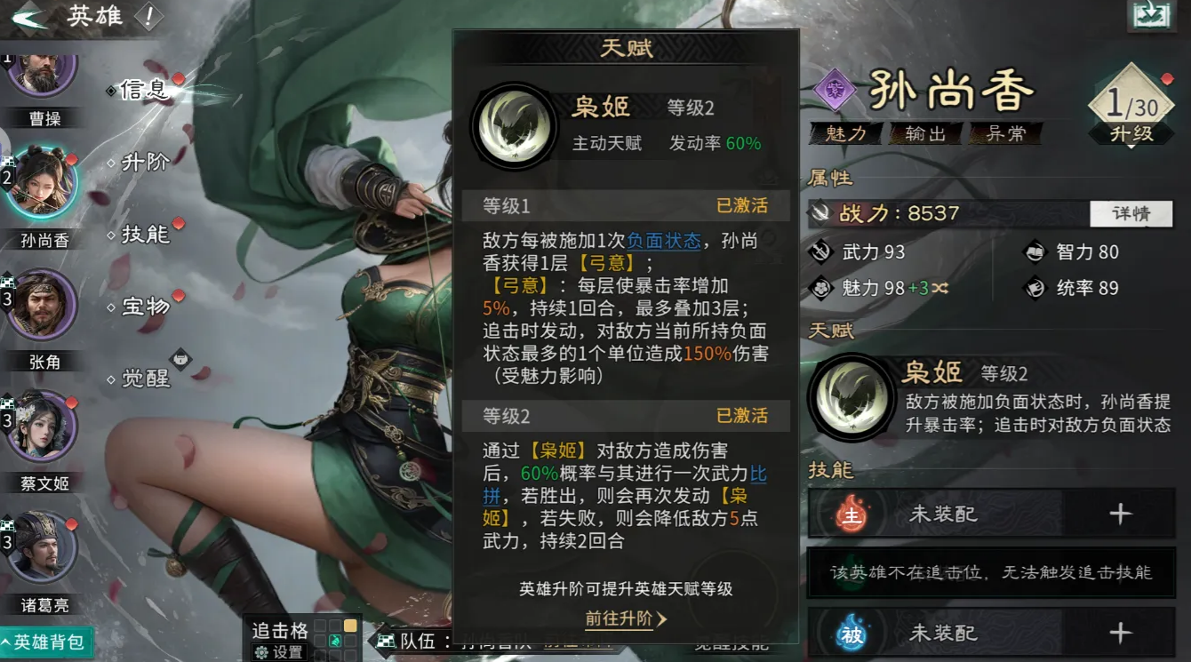 貂蝉的天赋闭月之貌不仅能让孙尚香提升10%追击伤害,还能以30%的概率额外触发孙尚香的追击,每回合最多触发三次,大幅提升孙尚香的追击频率。