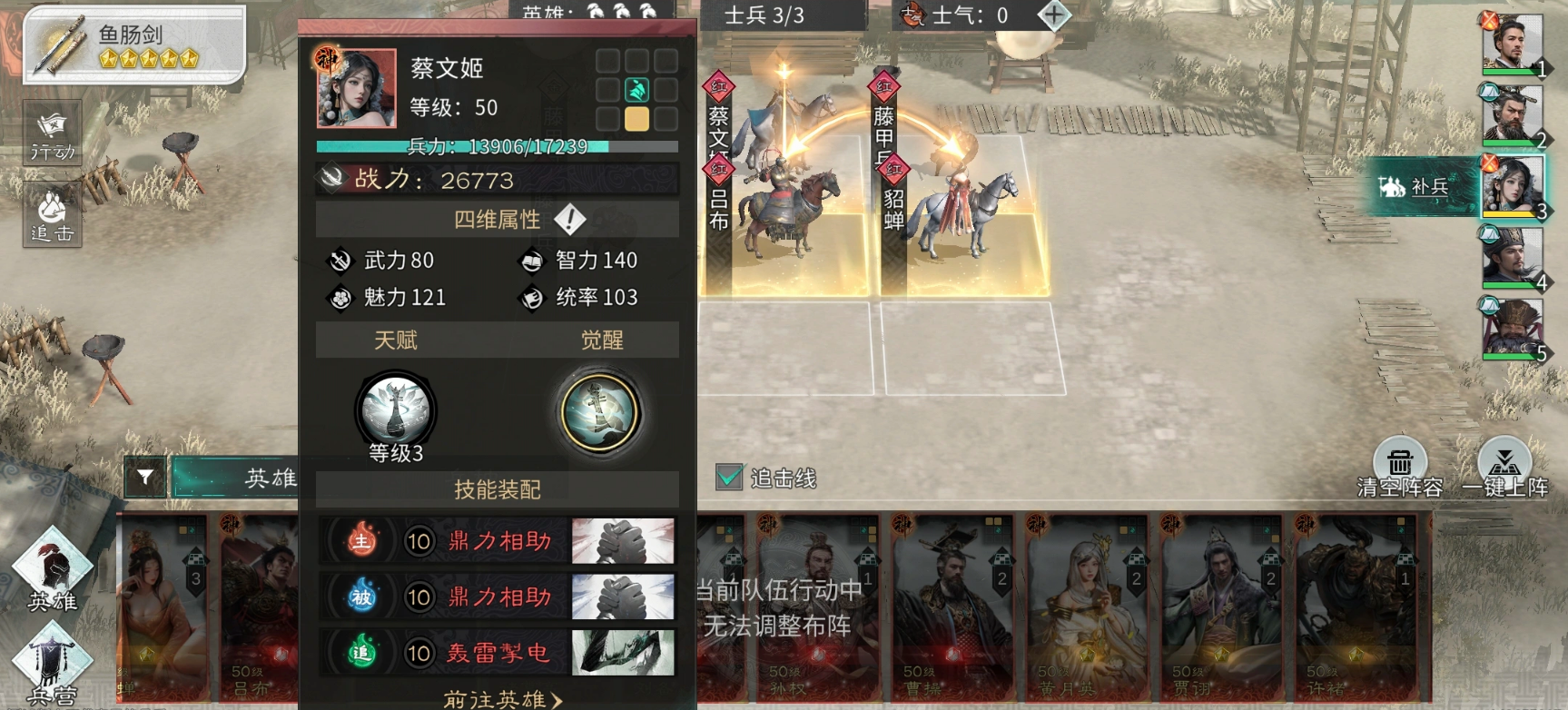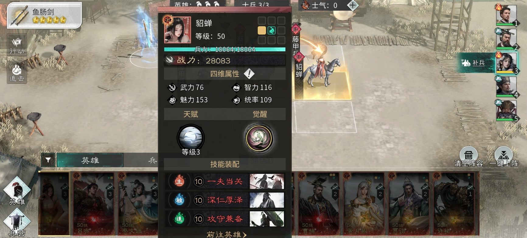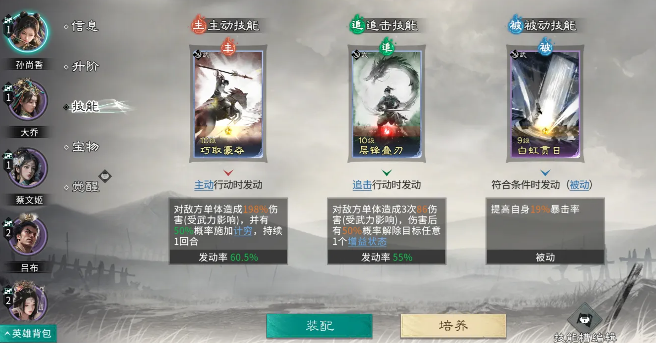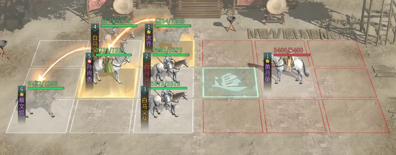 孙尚香在追击行动时发动技能枭姬,优先攻击敌方负面效果最多的单位,造成高额伤害,且有60%概率触发连击。借助蔡文姬和貂蝉提供的额外追击机会,孙尚香单回合可多次释放枭姬,快速积攒觉醒能量,满能量后释放觉醒技惊弦断流,对敌方全体造成高额伤害,若产生暴击,还能触发追加伤害,实现爆发收割。