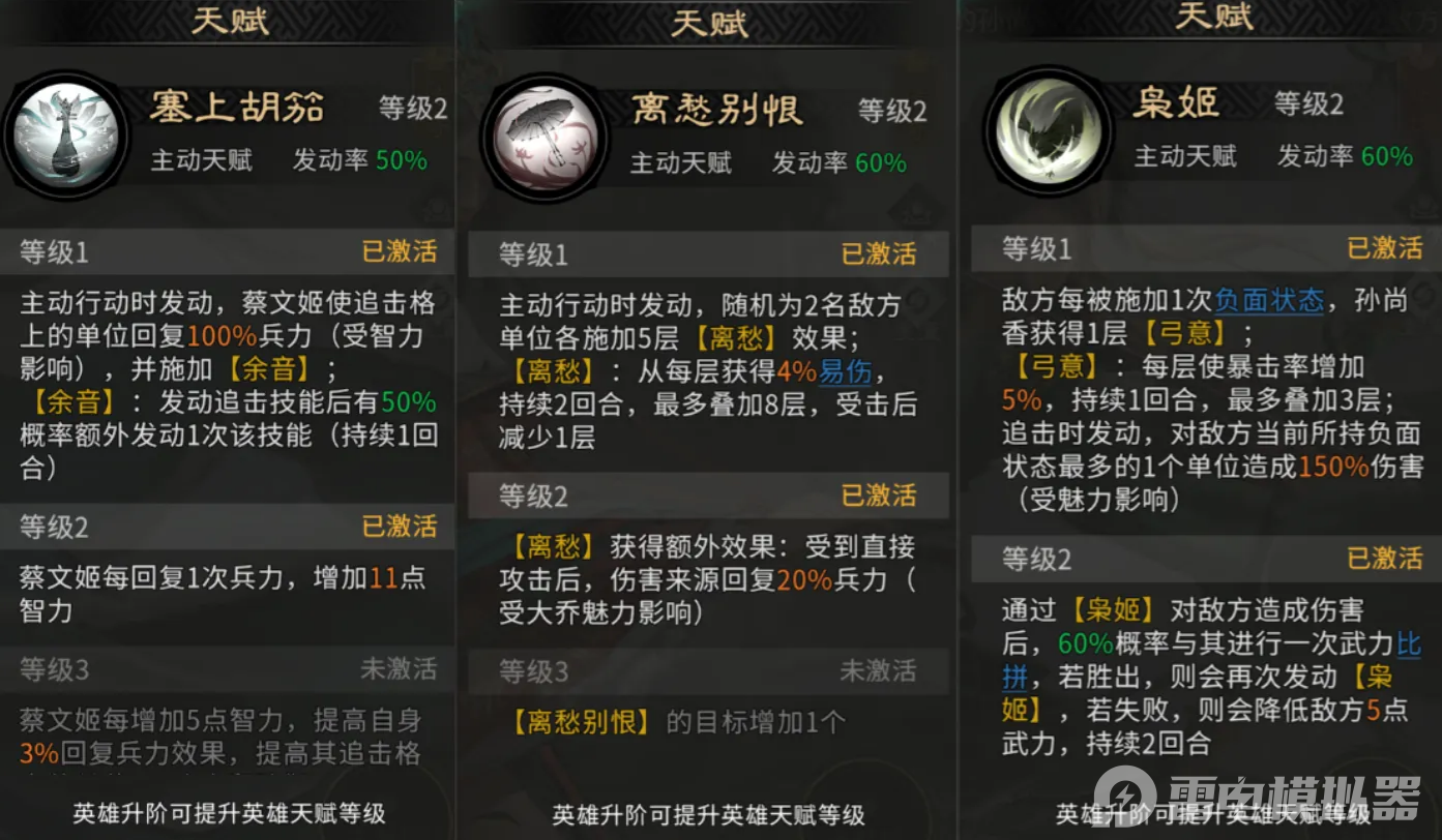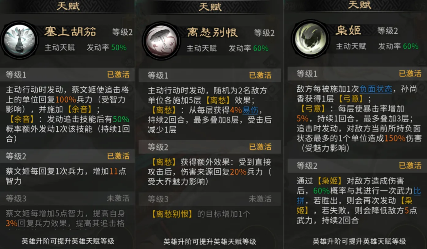 蔡文姬的天赋塞上胡笳可为孙尚香提供治疗,并赋予余音效果,直接为孙尚香增加一次额外追击机会。