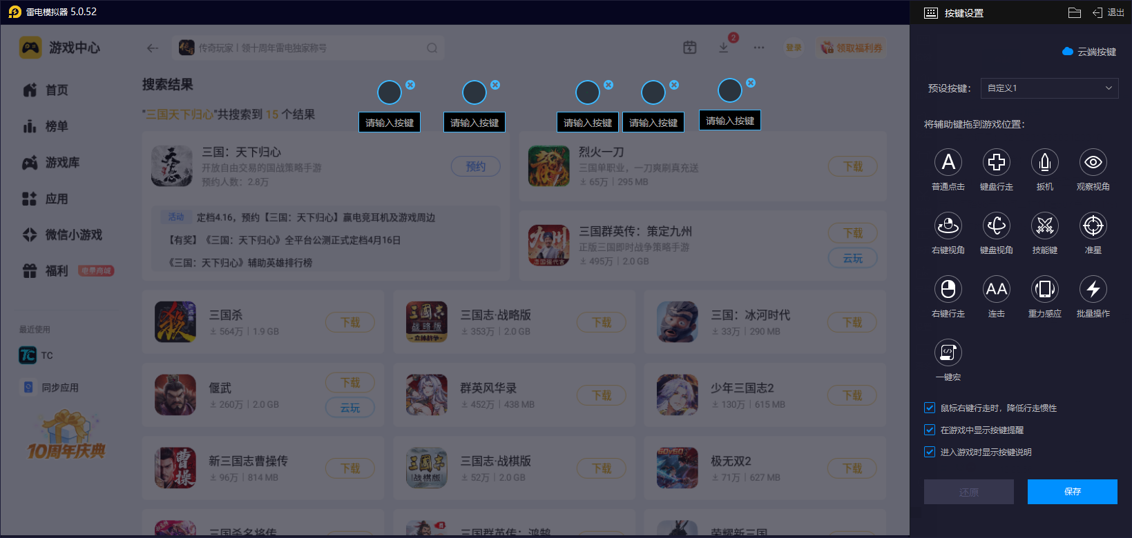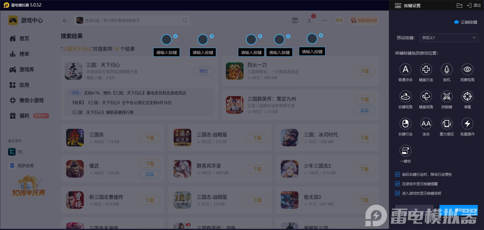 当我们进行操作的时候,可以直接通过雷电模拟器的按键自定义功能帮助自己,可以把孙尚香追击技能释放、辅助武将增益技能、阵容站位切换等高频操作,自定义绑定至键盘与鼠标。相比手机触屏,键鼠操作大幅减少误触,操作响应更迅速,最大化追击爆发力。