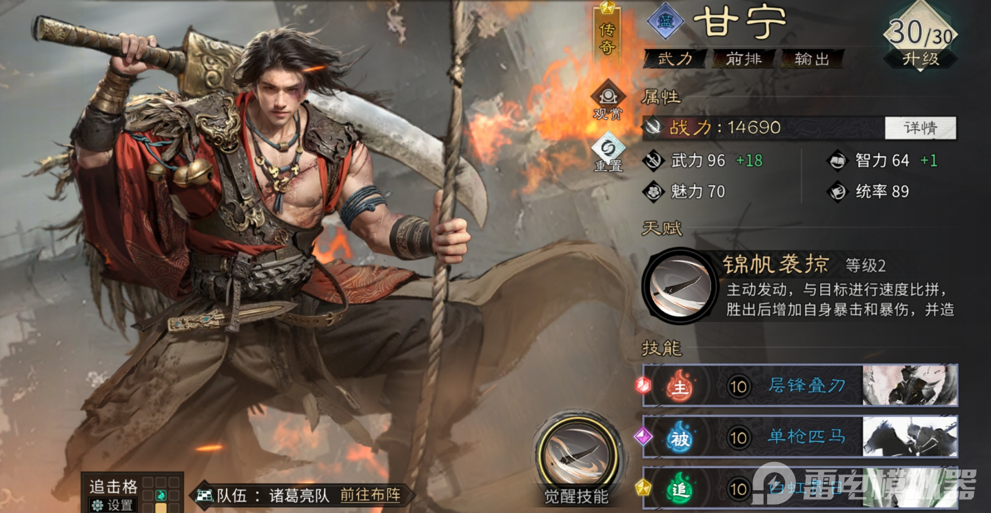 三国天下归心甘宁属于爆发能力非常突出的输出武将之一,尤其是在核爆阵容中表现亮眼。凭借极高的单体伤害和残血收割能力,他往往能在关键时刻直接击溃敌方核心单位。下面来了解一下三国天下归心甘宁吧。如果想更稳定地把握技能释放时机、观察战局变化,推荐使用雷电模拟器。