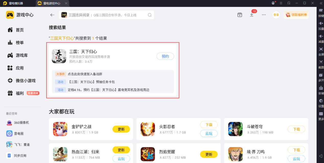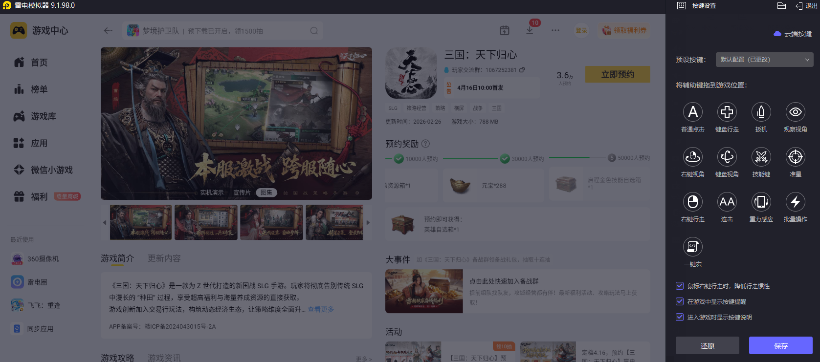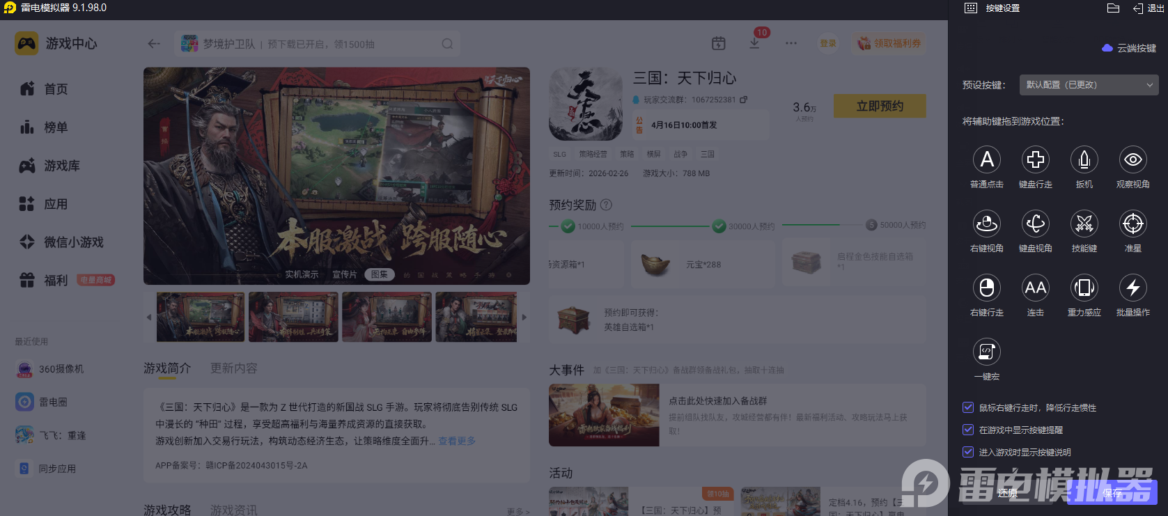 想要安稳玩上《三国:天下归心》,首先要锁定靠谱的下载途径,雷电模拟器就是下载并游玩这款游戏的优质选择,不仅下载步骤简单易操作,还能为游戏体验带来额外提升,非常适合长期玩这款手游的朋友。大家只需要在官网下载雷电模拟器,然后再雷电游戏中心搜索该游戏,然后点击预约即可。