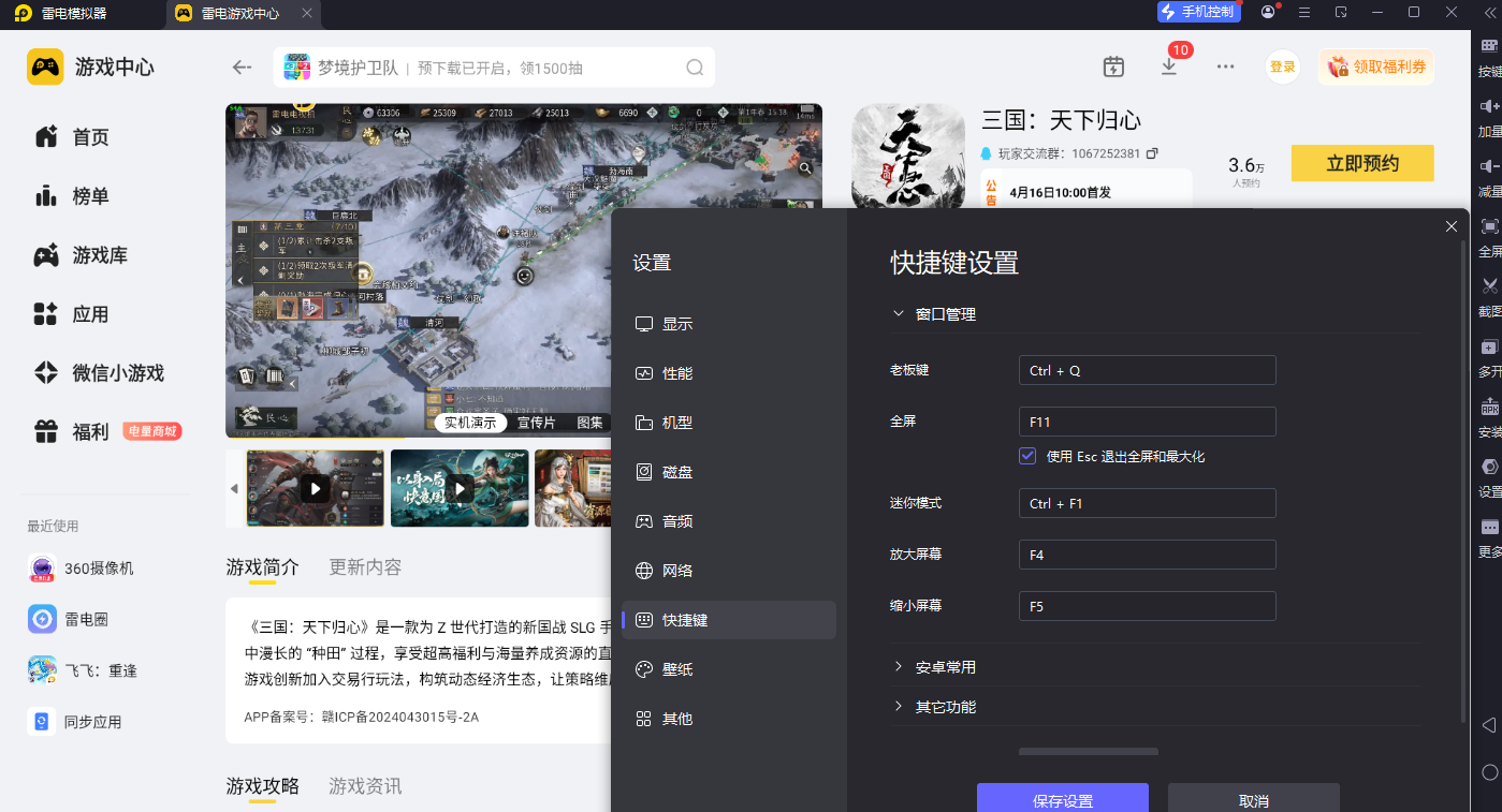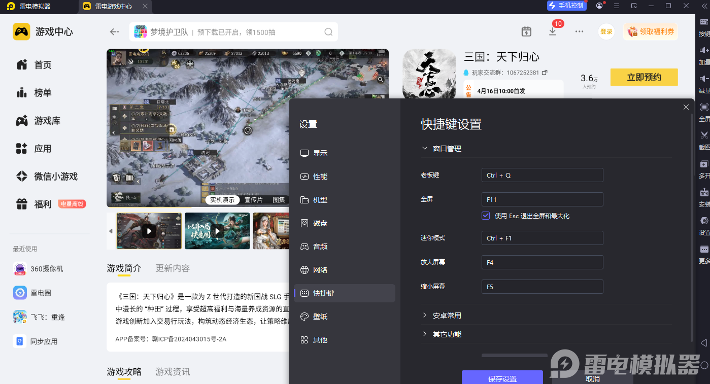 三国:天下归心核心包含九宫格布阵、武将调配、技能释放、城池经营等操作,需要频繁进行点击、拖拽、界面切换等动作,手机小屏操作时容易出现误触,会影响策略执行的效率与准确性。雷电模拟器采用键鼠操控模式,点击定位更精准,拖拽布阵更顺手,还能自定义快捷键,让复杂的策略操作变得简单顺畅,完全贴合游戏的操作需求。