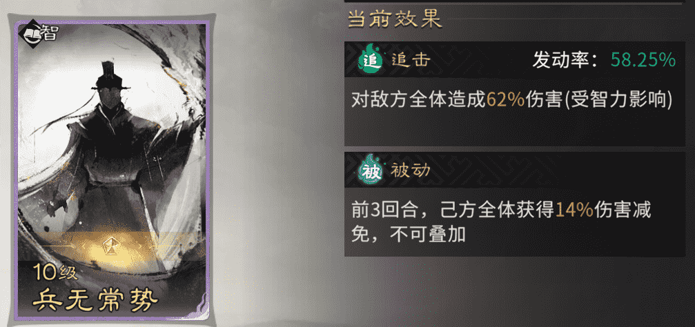 被动技能固定携带【兵无常势】,前3回合,己方全体获得14%伤害减免。为全队提供坦度。