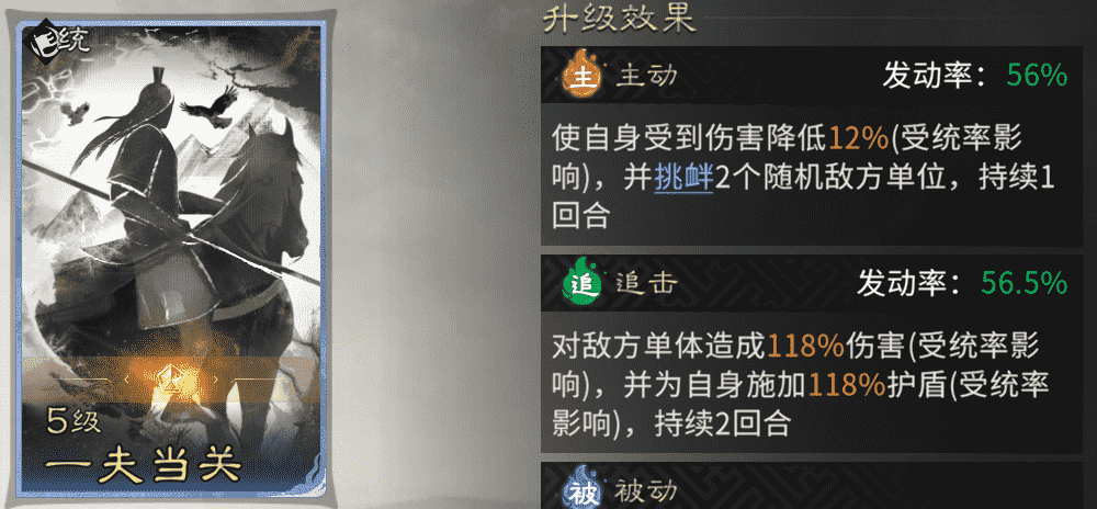 主动技能固定携带【一夫当关】,降低自身受到的伤害并随机挑衅2个敌方单位。
