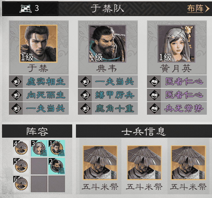 兵种站位:在队伍最后一列放置3个五斗米祭。