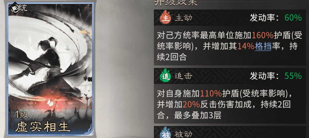 主动技能固定携带【虚实相生】,对己方统率最高单位施加护盾,并增加其14%格挡率。在典韦反击队中,【虚实相生】可以稳定对典韦释放,为其提供高额的生存能力。