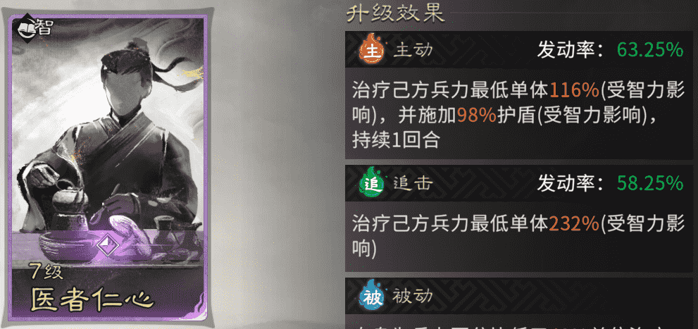 主动和追击技能固定携带【医者仁心】,主动发动时为己方兵力最低单位提供恢复以及护盾;追击发动时己方兵力最低单位提供高额恢复。在典韦反击队中,典韦会受到大量伤害,【医者仁心】能够很好的保证典韦的血量。