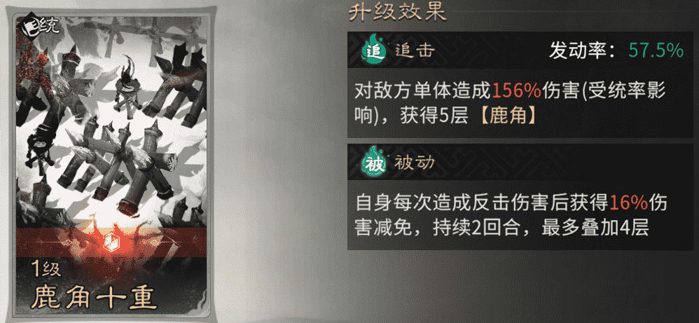 被动技能固定携带【鹿角十重】,每次反击后可以获得伤害减免,典韦频繁的反击可以让他获得高额的减伤。