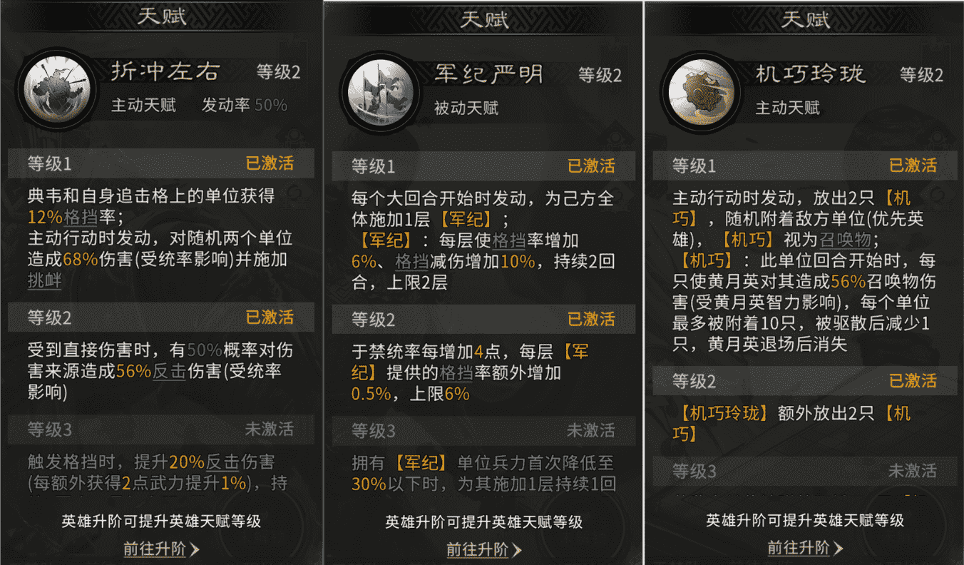 黄月英的天赋【机巧玲珑】可以放出【机巧】随机附着敌方单位(优先英雄),被【机巧】附着的单位,会在回合开始时受到伤害。【机巧玲珑】可以为队伍补充大量伤害,收割敌军。