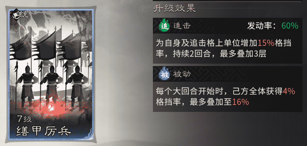 追击技能固定携带【缮甲厉兵】,为自身及追击格上单位提升15%格挡率。