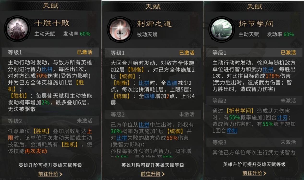主动技能和追击技能均固定携带【通权达变】,主动释放时使敌方随机3个单位攻击降低18%,持续2回合,并有50%概率施加1层计穷;追击释放时使敌方随机2个单位攻击降低24%,持续2回合,并有72%概率施加1层牵制。