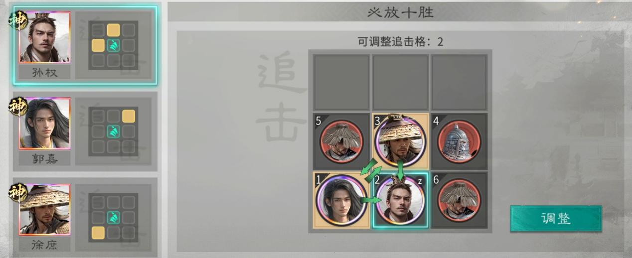 英雄站位:孙权不站追击格,徐庶和郭嘉站孙权追击格,郭嘉和徐庶互站追击格。
