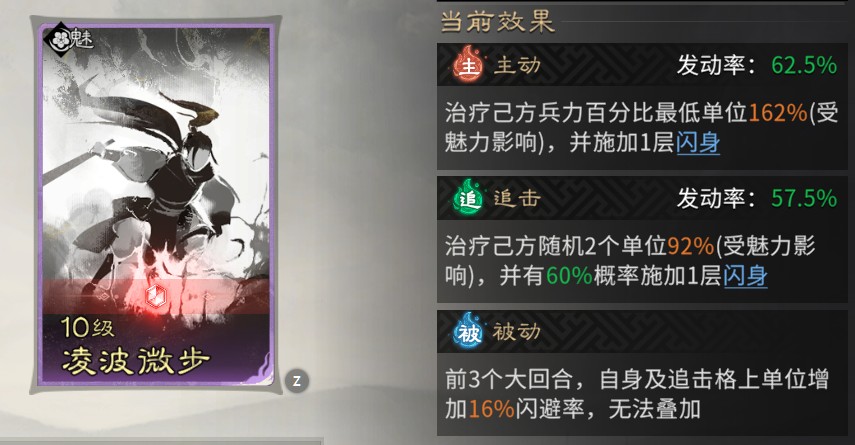 被动技能固定携带【凌波微步】,为自身和追击格上的单位提供闪避率,有几率规避敌方伤害。