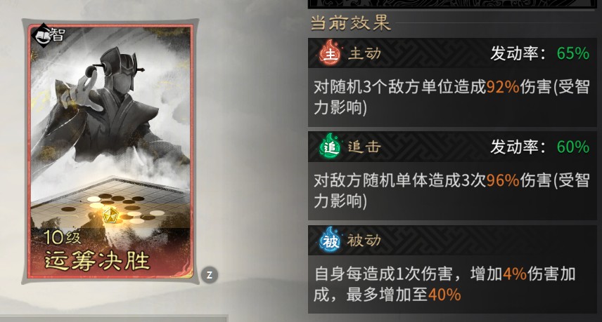 被动技能固定携带【运筹决胜】,自身每造成1次伤害,增加4%伤害加成,最多增加至40%。
