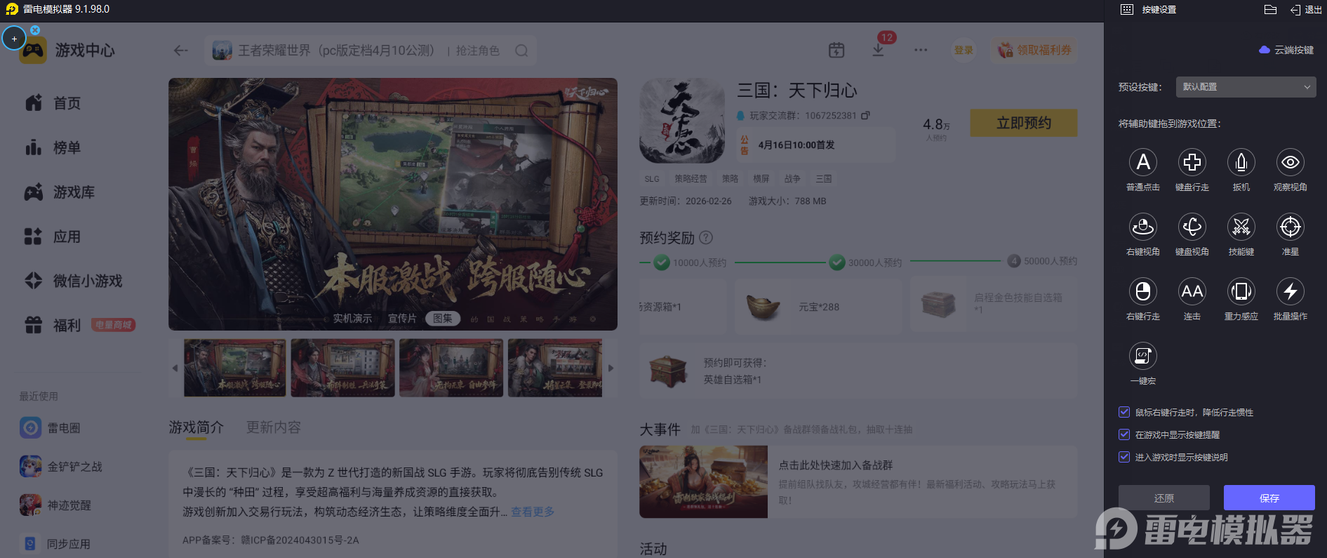 吞并玩法中,多线作战与快速调度是常态,需同时处理攻城指令、民心管理与防御布防等多项操作,界面交互频繁且节奏紧凑。雷电模拟器支持键鼠自定义设置,可将常用指令如武将派遣、指令下达、民心安抚等分配到不同按键,实现一键操作,大幅提升响应速度。这种设置契合吞并玩法中多任务并行的需求,让复杂操作变得流畅高效,避免因操作延迟错失战机。