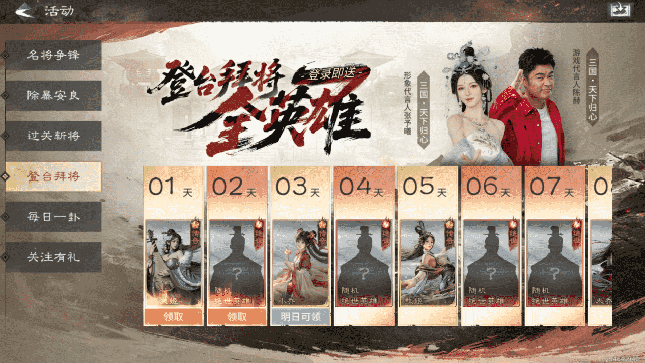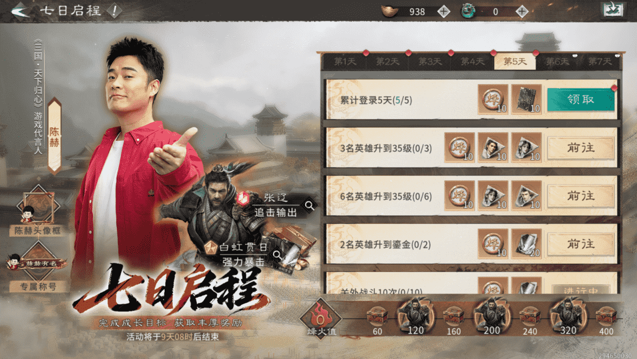 3.累计完成7日任务,更有天下归心卡包、海量英雄升阶碎片、强力暴击通用技能【白红贯日】等大量福利轻松获得!