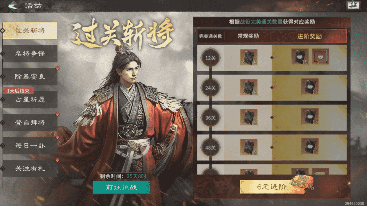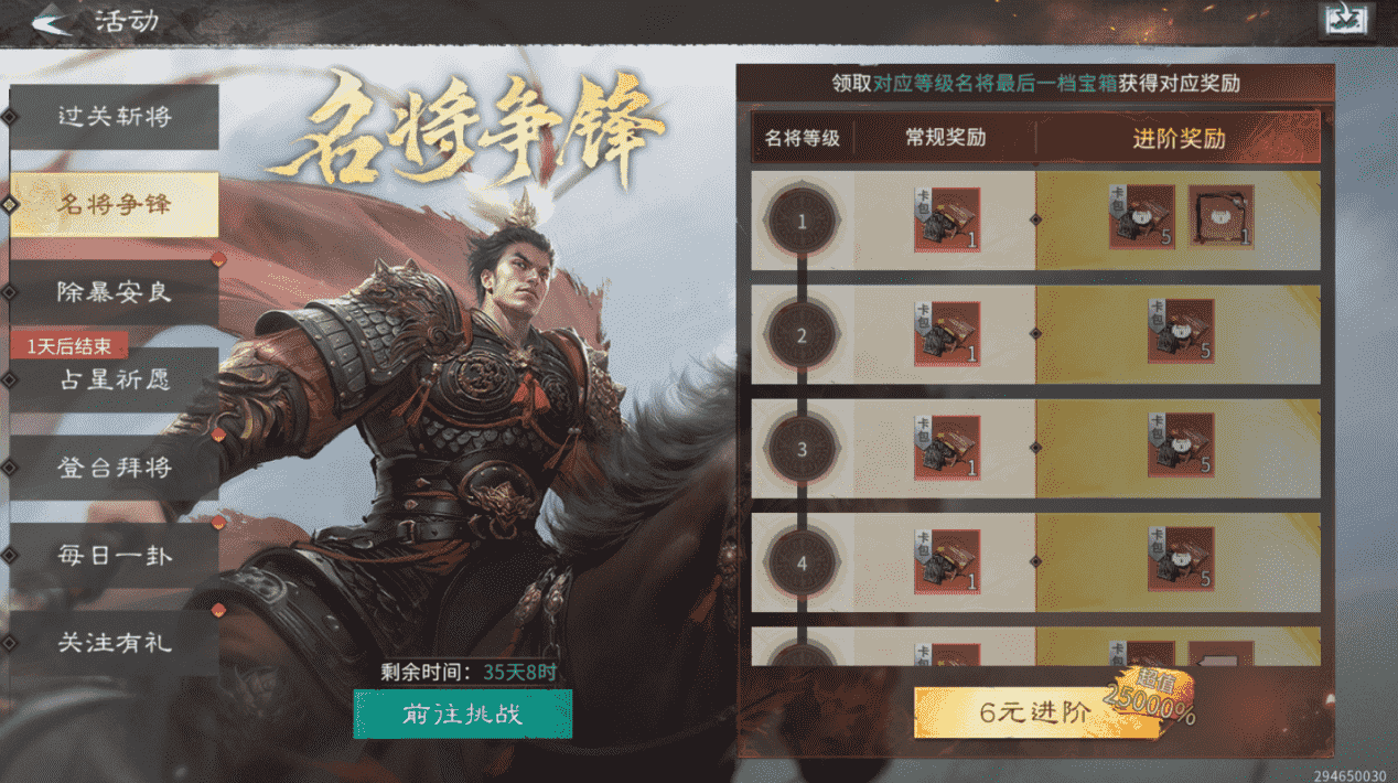 【活动内容】:过五关斩六将,战役完美通关所以战役可获得100抽天下归心卡包奖励!6元解锁进阶奖励,可额外累计获得300抽天下归心卡包奖励,更有限定头像框、聊天气泡、【战功彪炳】专属称号等你解锁!