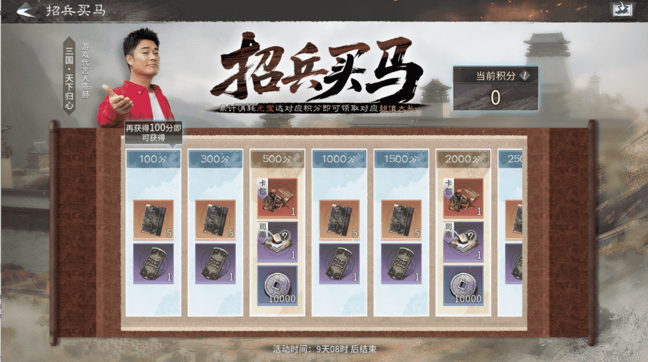 【活动内容】:累计消耗元宝达到对应积分,即可领取对应奖励:主题卡包自选箱、天下归心卡包、征兵符、银币、司南等大量奖励!