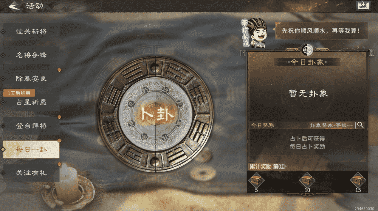 【活动内容】:每日卜一卦,随机获得元宝、天下归心卡包、征兵符、英雄碎片、英雄将魂、三足鼎立卡包等超多奖励!