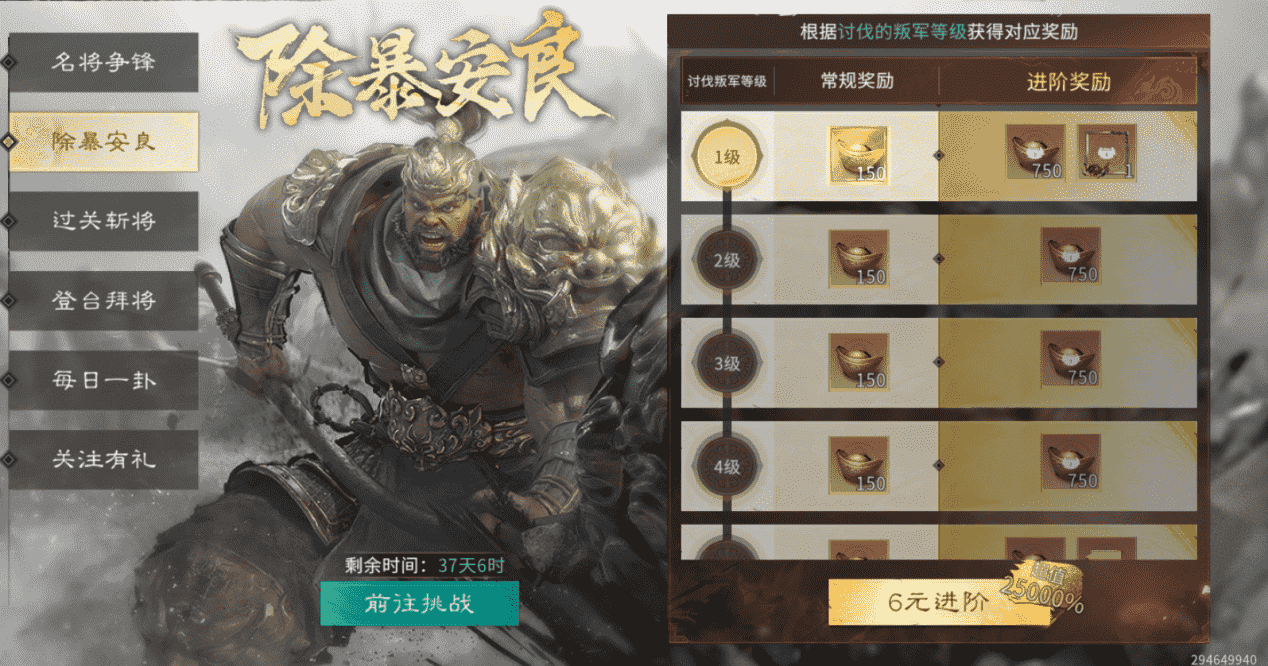 【活动内容】:前往讨伐叛军,通关可累计收获3000元宝,6元解锁进阶奖励,可额外累计获得15000元宝,更有限定头像框、聊天气泡、【平叛大将】专属称号等你来拿!
