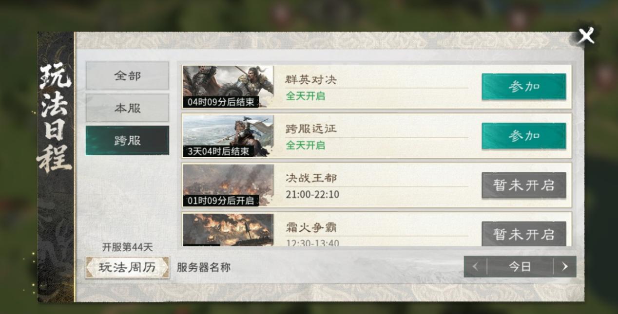 跨服远征、霜火争霸、群雄逐鹿、决战王都等同盟跨服玩法