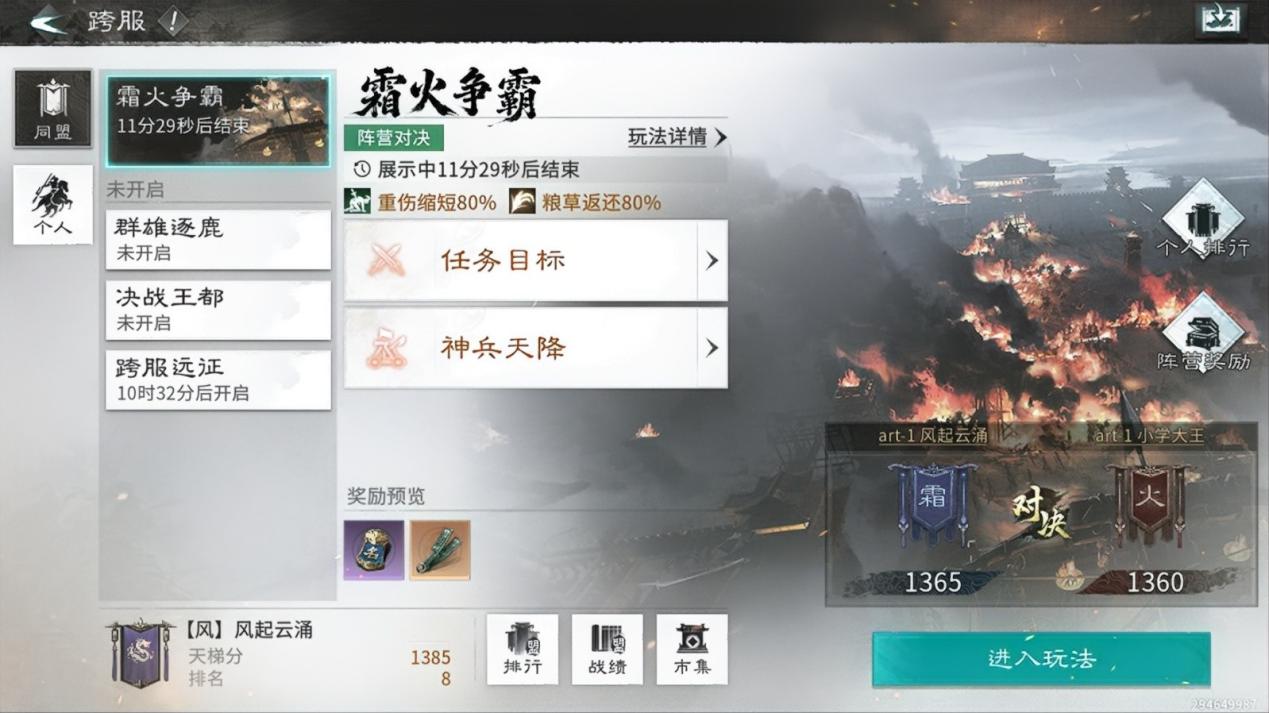 群英对决、运筹决胜、演武争锋、血战到底、沙场点兵等个人跨服玩法