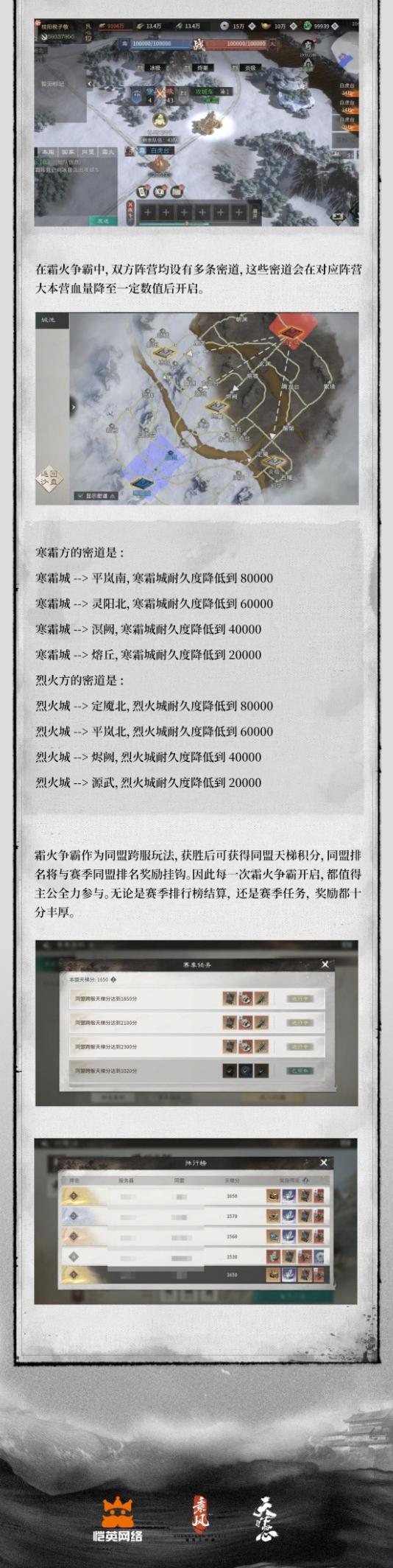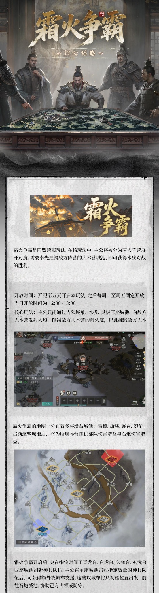 霜火争霸是同盟跨服玩法。在该玩法中,主公将被分为两大阵营展开对抗。需要率先摧毁敌方阵营的大本营城池,即可获得本次对战的胜利。