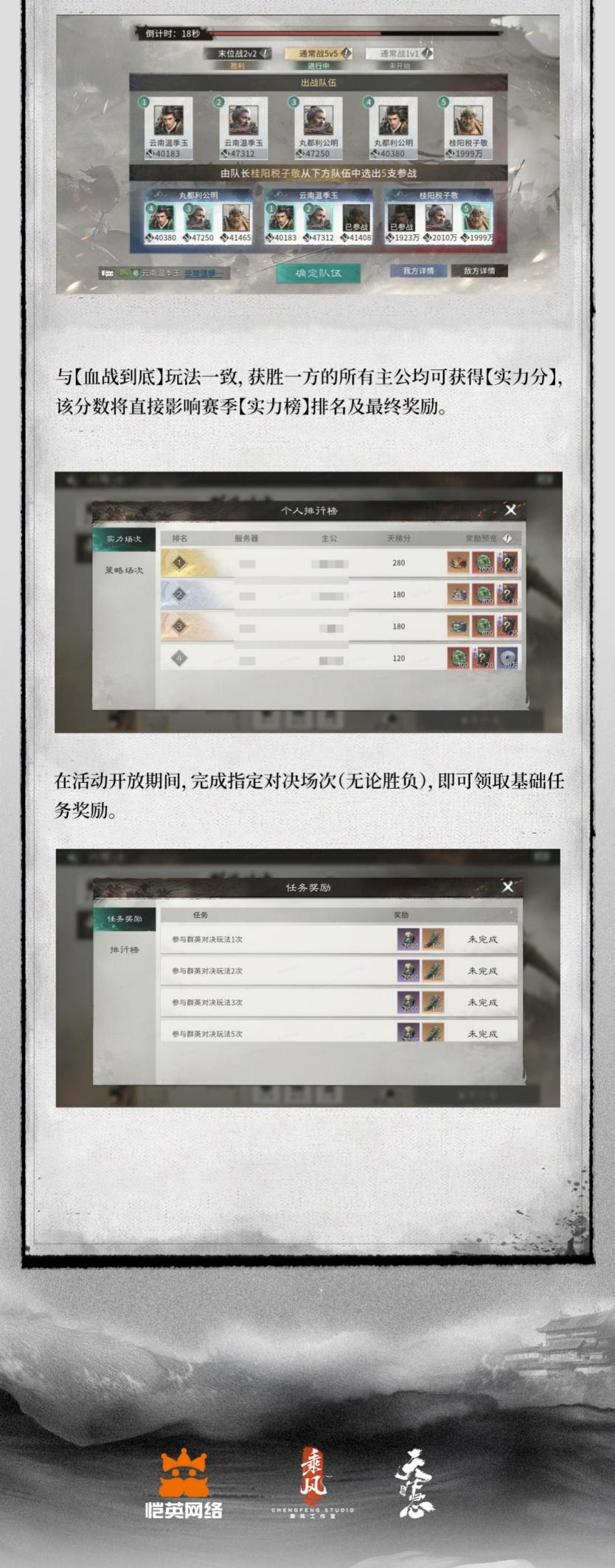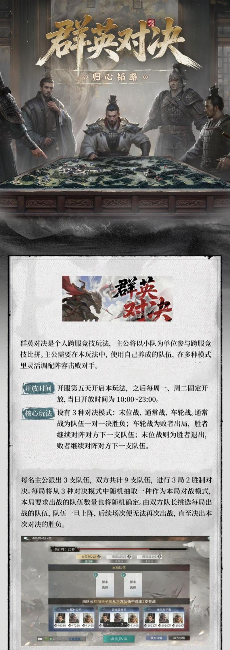 群英对决是个人跨服竞技玩法,主公将以小队为单位参与跨服竞技比拼。主公需要在本玩法中,使用自己养成的队伍,在多种模式里灵活调配阵容击败对手。