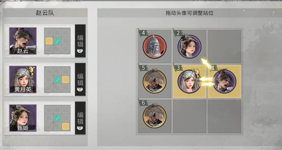 英雄站位:甄姬不站追击格,赵云站甄姬的追击格,并与黄月英互站追击格。