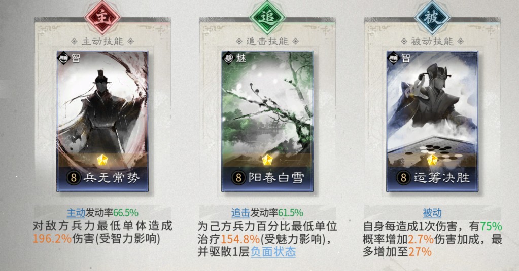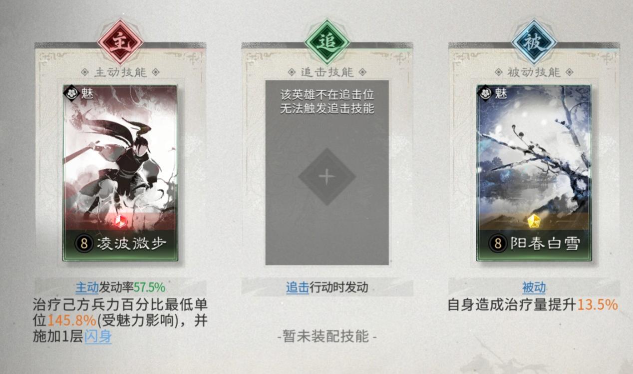 追击技能固定携带【阳春白雪】,治疗己方兵力最低单位,并能驱散一层负面效果。