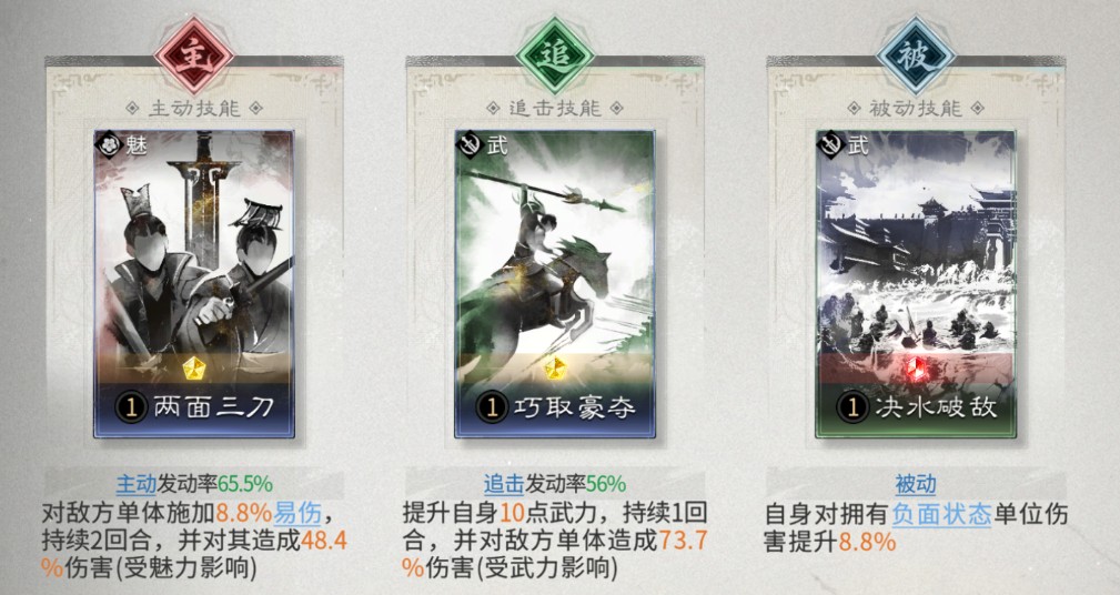 被动技能携带【决水破敌】,面对带有减益状态的武将时,可进一步提高自身伤害。