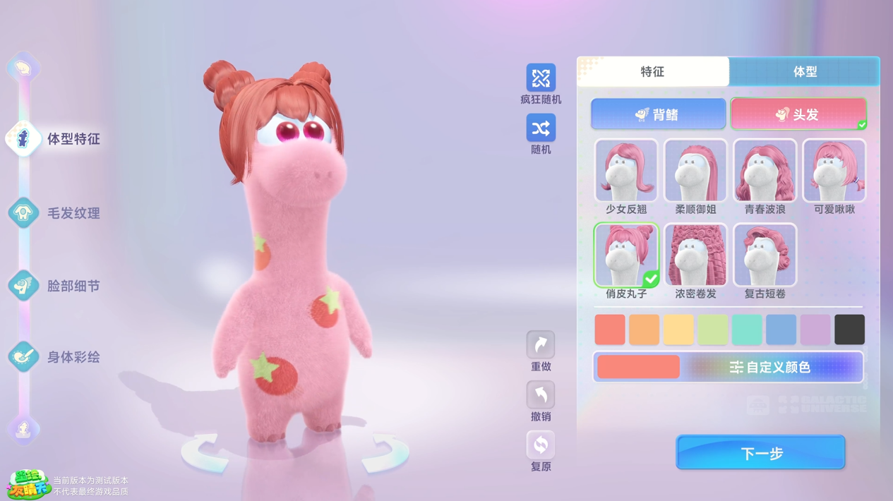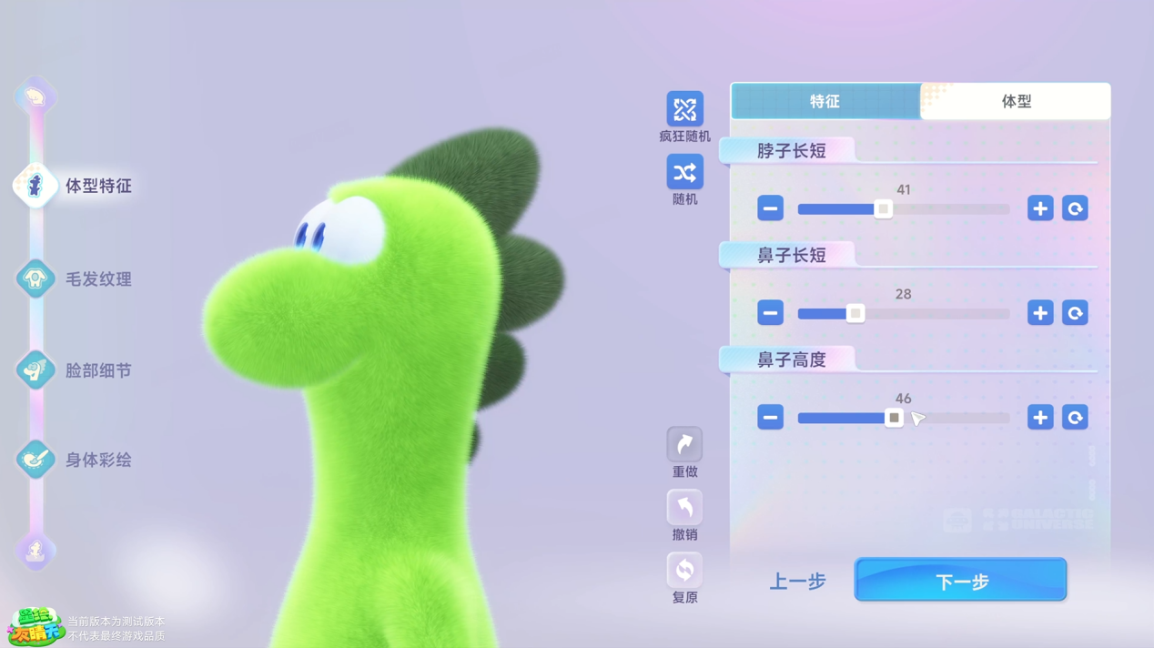 星绘友晴天捏脸玩法的第一步的是基础体型调节,操作简单易上手,新手也能快速适配。玩法支持多档体态预设与自由微调,偏好软萌风格可选择圆润敦实的幼龙体型,搭配短腿厚身结构,奔跑时自带轻盈弹跳感;喜欢飒爽气场,可拉长躯干与翼展比例,打造修长矫健的形态,展开翅膀时更具威严感。同时可调节脖子长短、身体胖瘦,搭配毛发基础设置,银白蓬松卷发显温柔,深棕短硬毛更具野性,快速奠定角色整体气质。
