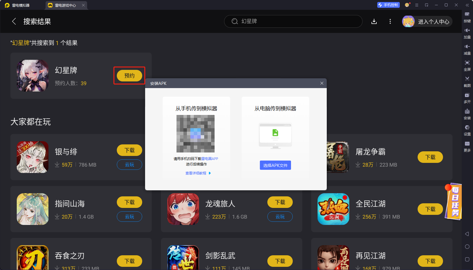打开雷电模拟器内置的“应用中心”,搜索“幻星牌”,下载官方正版,目前游戏正在火热预约当中,预约游戏后会有提醒,不会错过游戏信息噢!