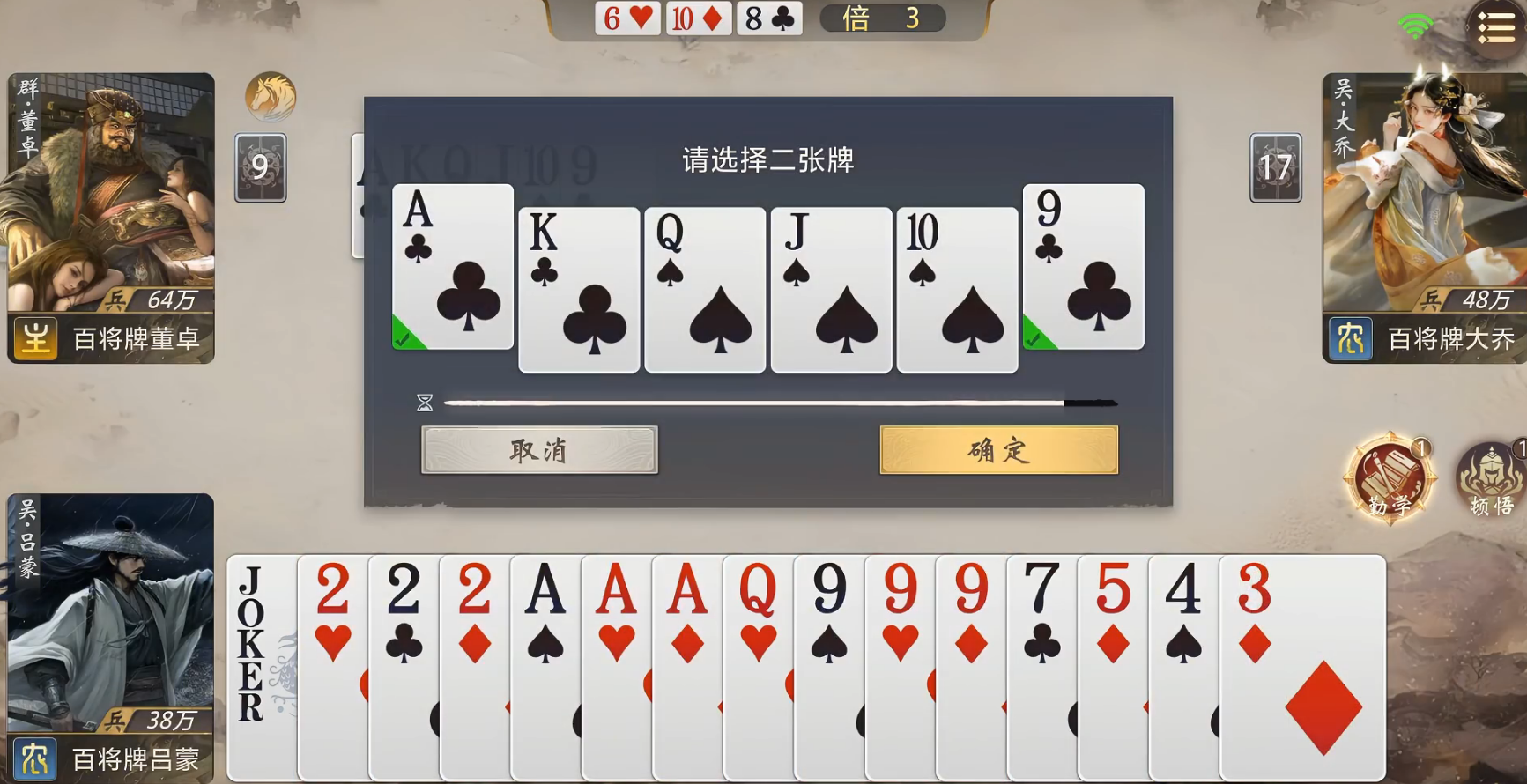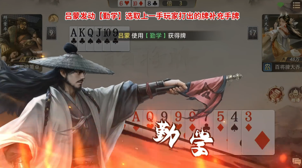 玩三国百将牌吕蒙,核心玩法围绕“蓄势—爆发”展开,切忌急躁抢牌权。起手无炸弹时,优先打出低点数单张或对子试探,耐心观察场上牌型流向,不轻易发动【勤学】技能。待场上出现可补成炸弹的关键牌时,再用【勤学】截取所需牌张,凑成炸弹后触发【顿悟】,重置技能次数形成循环。当地主可借先手优势引导牌型,当农民则需配合队友,队友可打出未现牌型助其补炸,对手则需避免出对子、顺子给其可乘之机。
