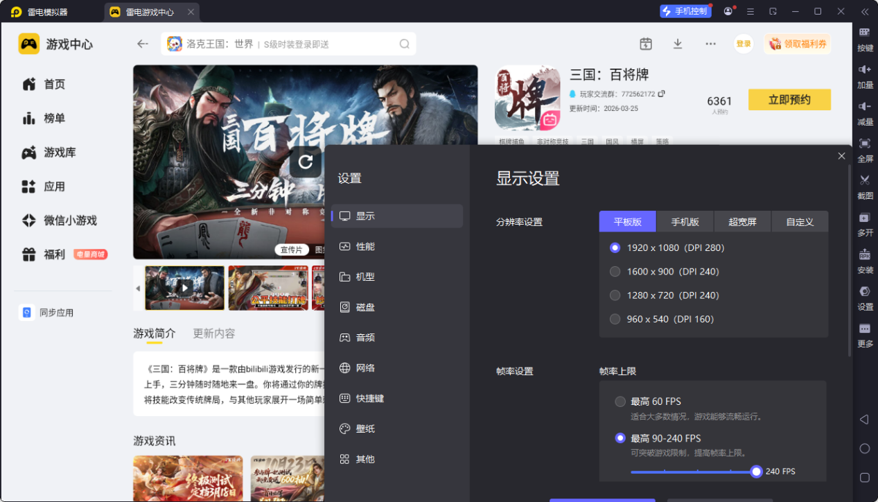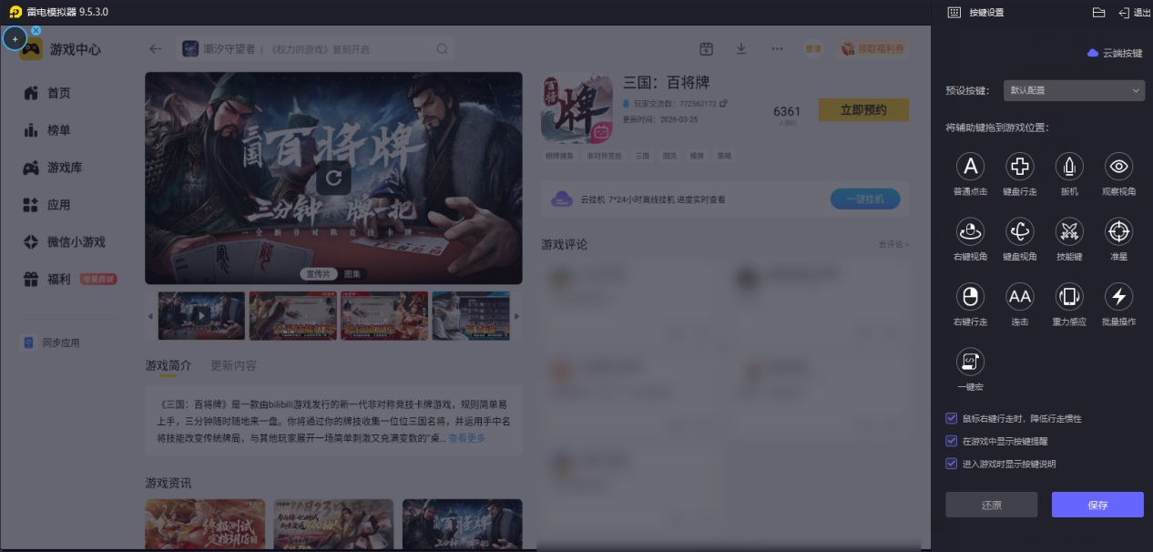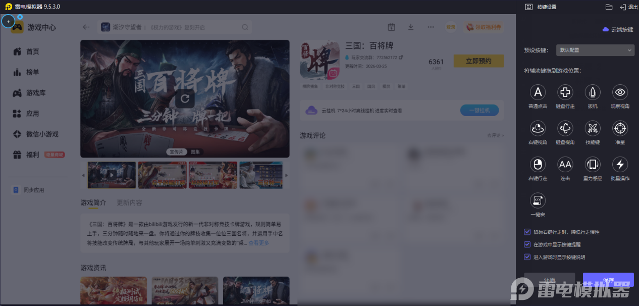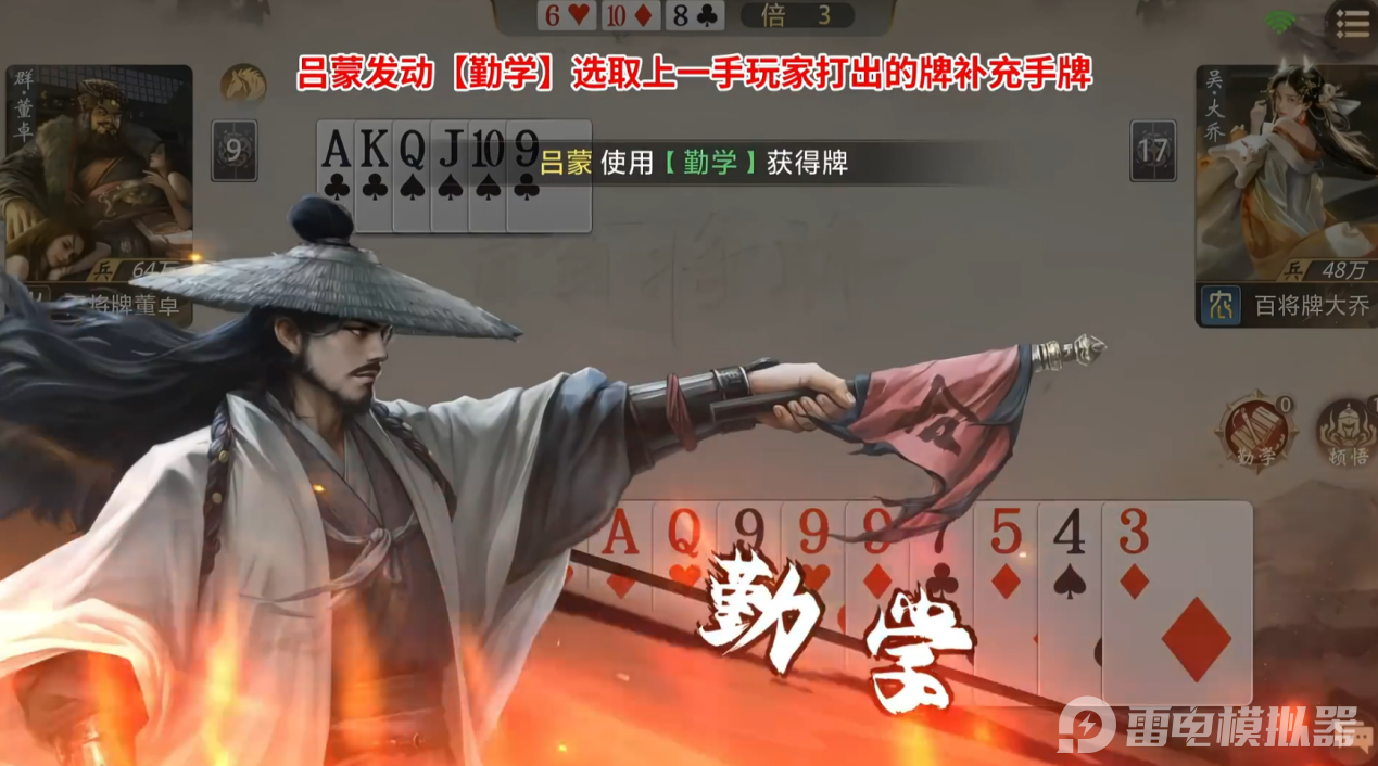 三国百将牌吕蒙的操作核心在快速决策,雷电模拟器的智能匹配手机端键位功能,能让操作更流畅。它可自动适配游戏操作,将出牌、跳过、触发技能等关键操作对应键盘按键,响应速度远超手机触屏,避免触屏误触浪费技能,让你在吕蒙爆发阶段快速衔接操作,精准把控每一次【勤学】的发动时机。