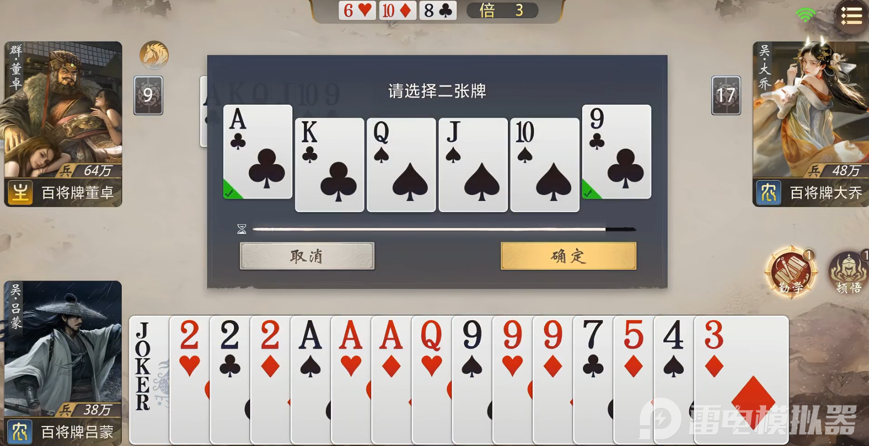 玩三国百将牌吕蒙,看清场上牌型和技能冷却至关重要,雷电模拟器的高清大屏的优势的尤为明显。它能清晰呈现每一张牌的点数、花色,以及吕蒙【勤学】技能的可用次数,避免手机小屏漏看关键信息,让你精准判断何时偷牌补炸,完美衔接【勤学】与【顿悟】的联动,最大化发挥三国百将牌吕蒙的策略优势。