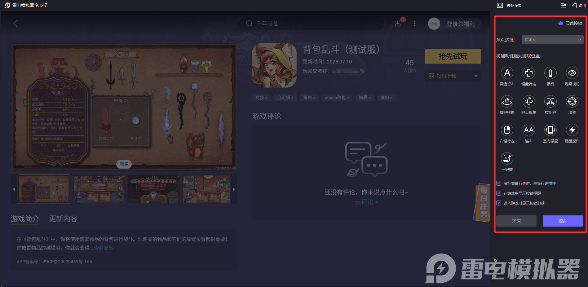 掌握了这份背包乱斗流派推荐,你是否已经跃跃欲试?想要更流畅地体验策略搭配与战斗操作?雷电模拟器能为你提供最佳的游戏环境,无论是多开刷装备还是精准操作,都能轻松实现!