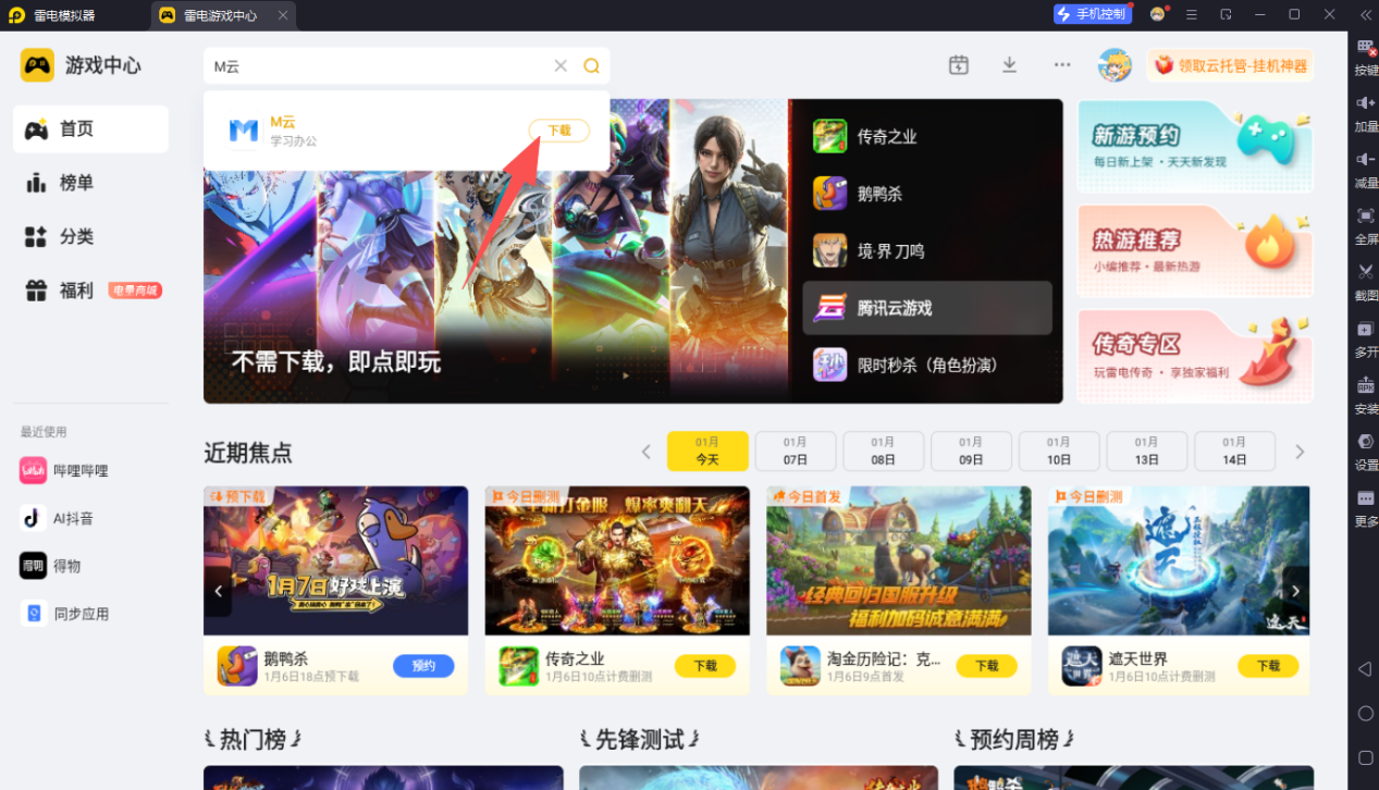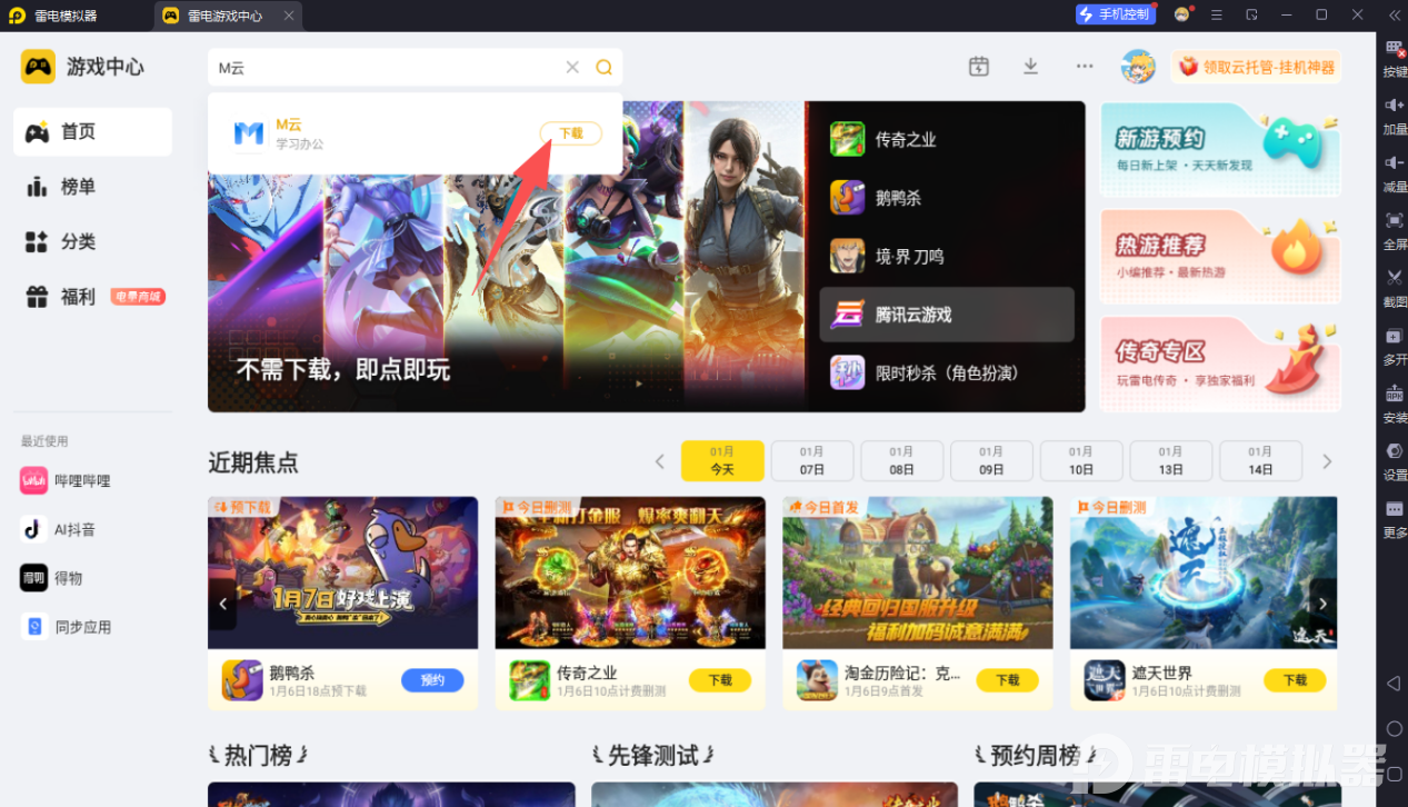 安装好雷电模拟器后,打开主界面,点击进入游戏中心,在搜索栏输入“M云”,只需点击下载按钮,模拟器便会自动开始下载并安装M云电脑版,整个过程无需用户过多操作,十分便捷。安装完成后,就能在模拟器中尽情使用M云电脑版了。