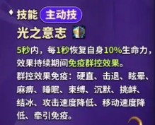 主动技:光之意志,5 秒内,每 1 秒恢复自身 10% 生命力,效果持续期间免疫群控效果(群控效果包括:硬直、击退、眩晕、麻痹、睡眠、束缚、沉默、挑衅、结冰、攻击速度降低、移动速度降低、牵引)