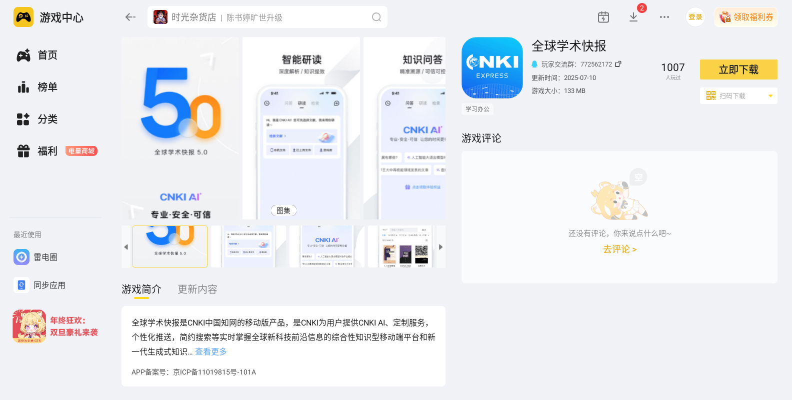 想要在电脑上使用全球学术快报电脑版,雷电模拟器是性价比很高的选择。大家可以直接在雷电模拟器中的雷电游戏中心下载全球学术快报电脑版。无论是写论文、做研究还是查资料,这样的搭配都能帮你节省时间、提高效率,让学术研究更轻松。