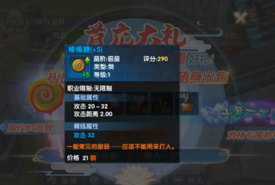 除去其他前期必需材料,6 元礼包里最值的是 BT 武器棒棒糖,棒棒糖是前期非常好用的高输出武器,装备上后输出直接翻倍,早买早提高刷怪速度,要知道提高刷怪速度就等于提高升级速度,升级可是我们前期的首要任务。