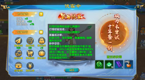 然后是几乎全能加成的武林侠客称号,不仅有最基础最实用的经验加成和金币加成,还有稀有的装备成功率加成和独特的妙手空空加成,简直是为搬砖玩家量身打造!