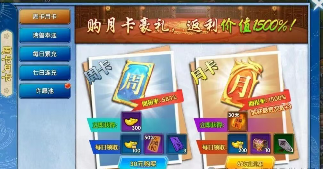 月卡性价比是周卡的三倍,一个月下来就能有 6000 绑元,日常开销完全没问题!而且还额外多了三次武林悬赏次数,多打一次就是多拿一次奖励!