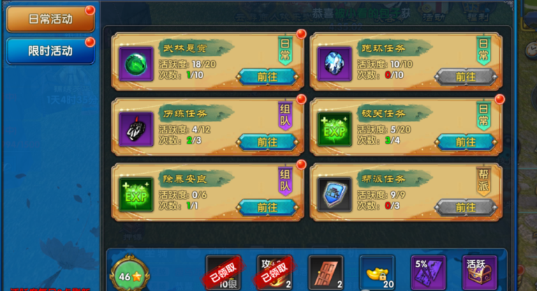 【零氪党生存指南:勤勉换资源,稳扎稳打也能赢】职业首选枪豪或医师——枪豪血厚防高,“暴雨梨花枪”群攻清怪快,开荒容错率拉满;医师是团队刚需,“百毒不侵”技能能套无敌,低战力也能轻松混高难副本。日常任务按优先级排序:武林悬赏(优先橙紫品质,每日免费刷新 2 次)>除暴安良(5 人组队末环经验翻倍)>18:30 帮派传功(6 人满队经验超 3 小时刷怪)。