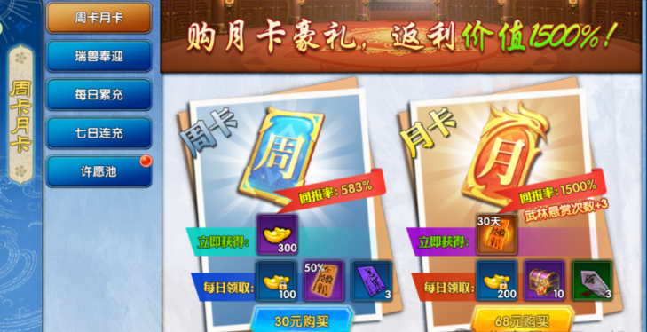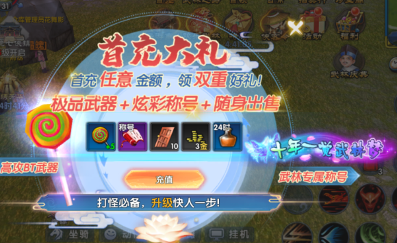 【微氪首选:6+68 元解锁核心权益】首充 6 元就送 BT 级武器“棒棒糖”,攻击力直接碾压新手装,搭配 24 小时生命恢复 buff,刷本效率提升 30%。68 元月卡是必买项,每日领 200 绑元+1 小时经验符,30 天累计的经验和金币加成各 10%,足够支撑前期装备强化。再补 68 元开一档侠客令,解锁随身仓库和自动卖货功能,挂机搬砖更省心。