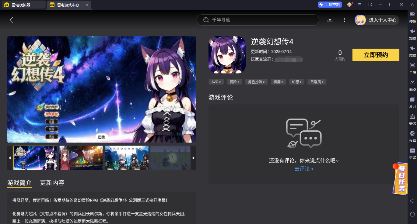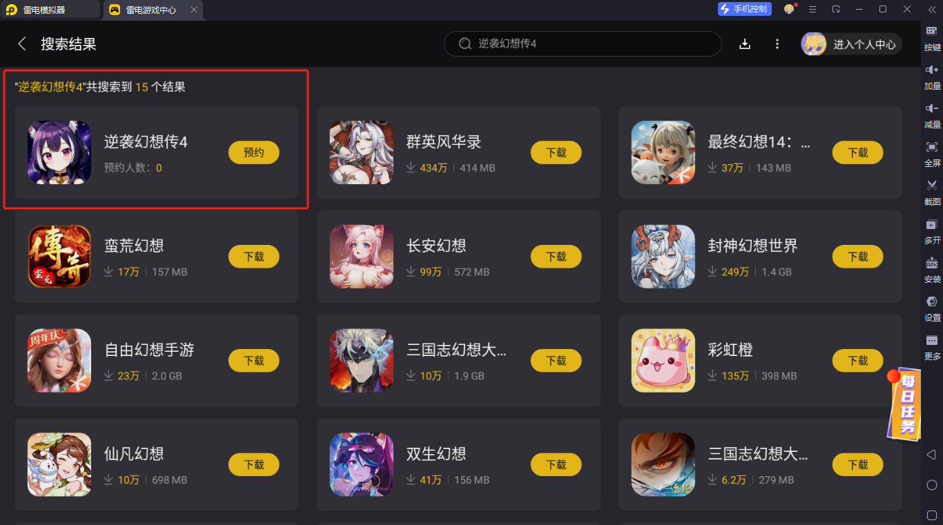 这款新游是只发行手游端,但并不意味玩家没办法玩到电脑版,利用雷电模拟器就能达成该目的,将它安装在pc设备上后,就能在游戏中心查找各种佳作进行下载。经过搜索,可以看到有逆袭幻想传4的专区。由于目前游戏尚未上线,玩家可先进行预约,后期正式公测即会更新下载按钮,到时点击按照提示完成安装即可正常玩到所有内容。