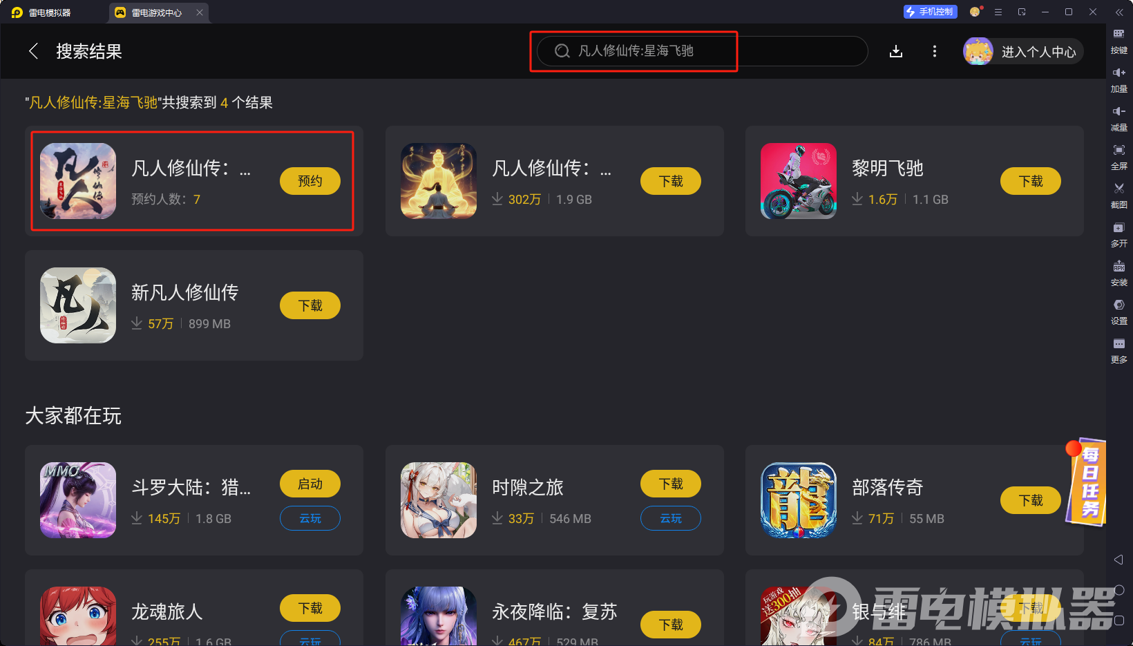 模拟器内应用商店搜索“凡人修仙传星海飞驰”进行预约,游戏上线可以自动安装噢。