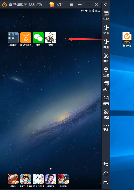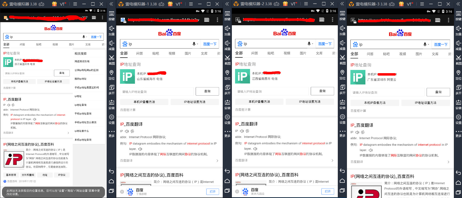 [b]专业解答:有关模拟器多开,每个模拟器Ip都不同的解决方法[/b] 第一:需要准备,一个模拟器(目前市面上的雷电、**等,模拟器都行) 第二:需要IP修改工具,推荐百度搜索,‘’飞猪ip代理‘’(它是专门针对游戏挂机多开,研发的一款IP修改软件,目前口碑也还是不错的)体验了一下,效果还是不错的 第三:一台电脑想要4个IP都不同,可以开4个模拟器,在上面装4个飞猪,就是4个同的IP 1.下载安卓版飞猪IP软件 2.把安卓版的飞猪从电脑上,拖到模拟器里面安装, 3.登陆飞猪软件如下图,选一条线路连上 4.成功连上,4个窗口显示不同的4个IP